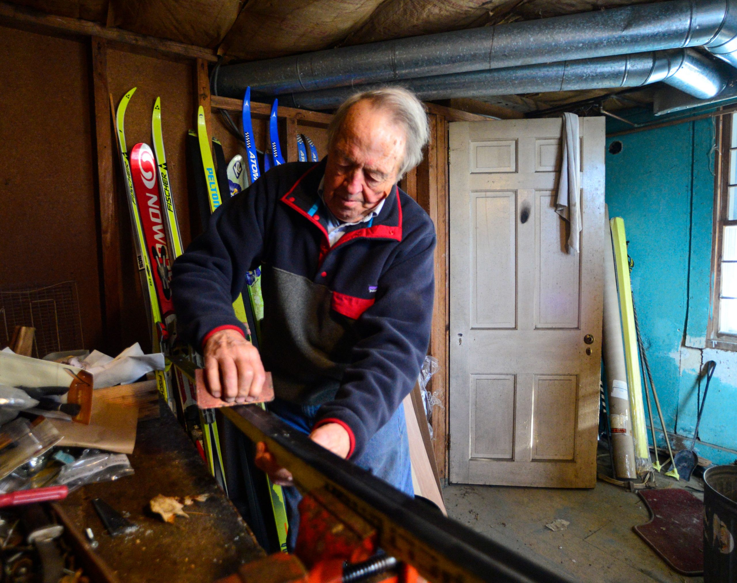 The basement of John Caldwell’s Putney, Vt. home serves as his workshop for waxing his cross country skis. Caldwell still enjoys skiing despite having had both knees replaced. Photo by Kris Radder.