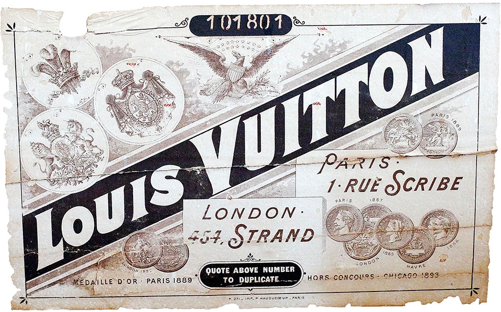 The custom-made men’s travel trunk, which is lined with canvas painted with tan hemp oil and a red stripe at each end, still has the original Louis Vuitton label with its registration number. The number was recorded by the company to allow the owner to have repairs made or new luggage fashioned from the same design. The style of the label and its location indicate it was built and purchased between 1893 and 1900.