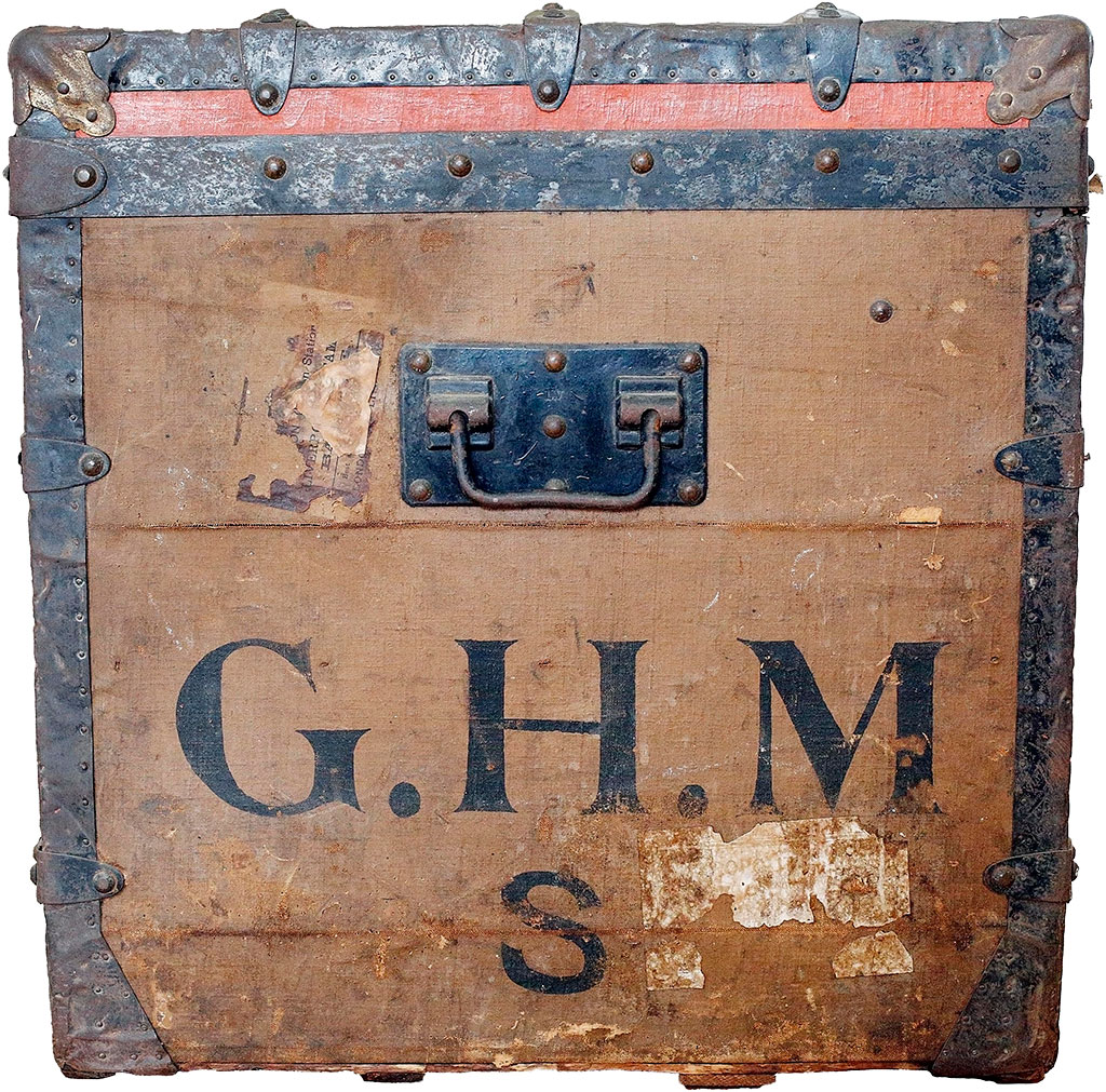 Today, the trunk still has George Mogran’s initials G.H.M. painted on each end, with an ‘S’ below, perhaps indicating his wife, Sarah. A sticker still affixed to the trunk indicates it was used for travel in Europe in 1896. That year, George traveled to Germany with Sarah, where she visited many German spas in hopes of curing her ailments. Sarah succumbed to a heart condition in July 1896 while traveling in Germany.